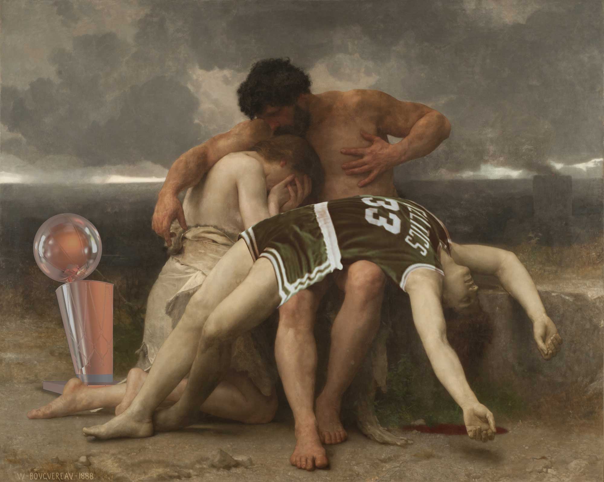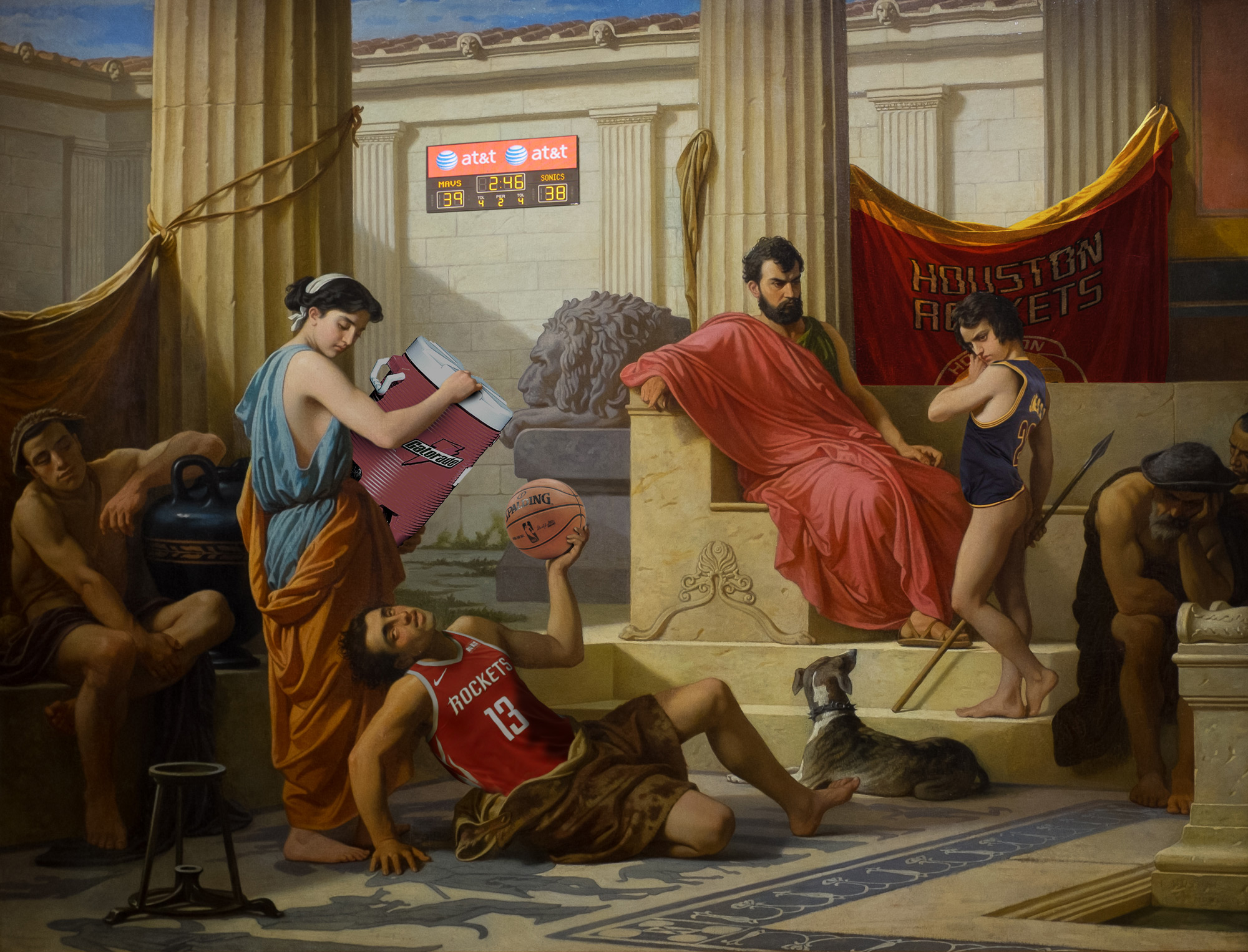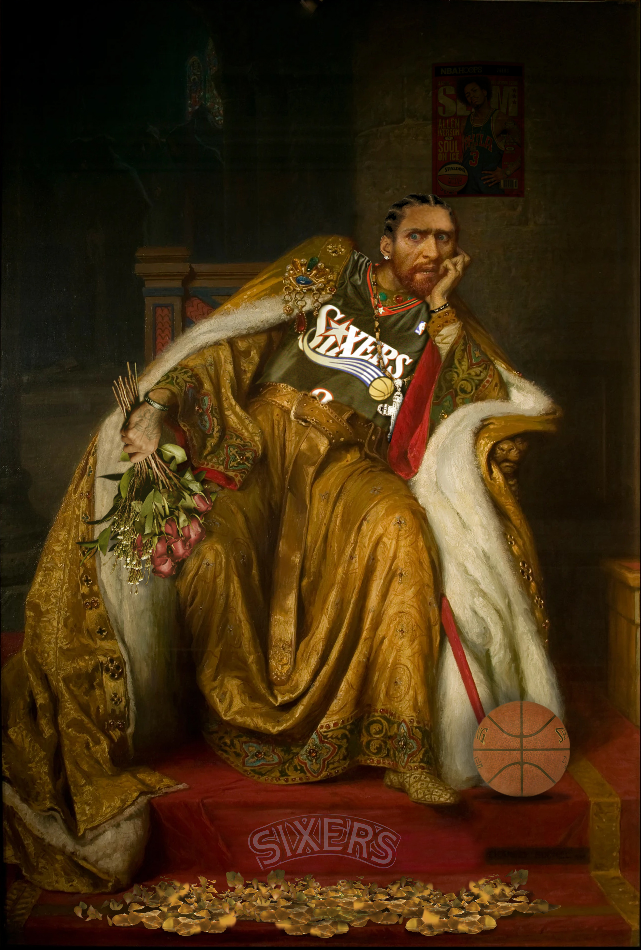 Allen Iverson est une image autant qu’un joueur. Cette reprise d’une couverture mythique de Sports Illustrated, transposée en vocabulaire Renaissance, souligne la canonisation médiatique : l’athlète élevé au rang de figure picturale.