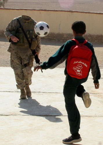 L’unité de notre ami Jerry continue son travail d’éducation des masses laborieuses. Ici, l’apprentissage des jongles sous la menace d’un M16 se révèle particulièrement efficace. Le jeune Hamid comptabilise 18564 touchers successifs sans que le ballon tombe par terre.