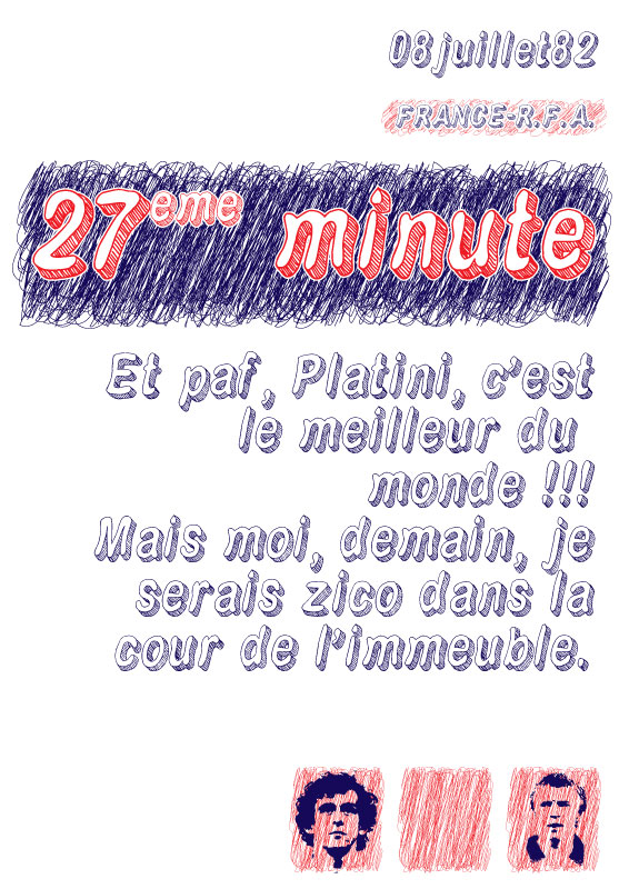 27eme minute : Suite à une faute sur Rocheteau, notre ange à nous qu’on a, Platini transforme le penalty et la France revient à la marque