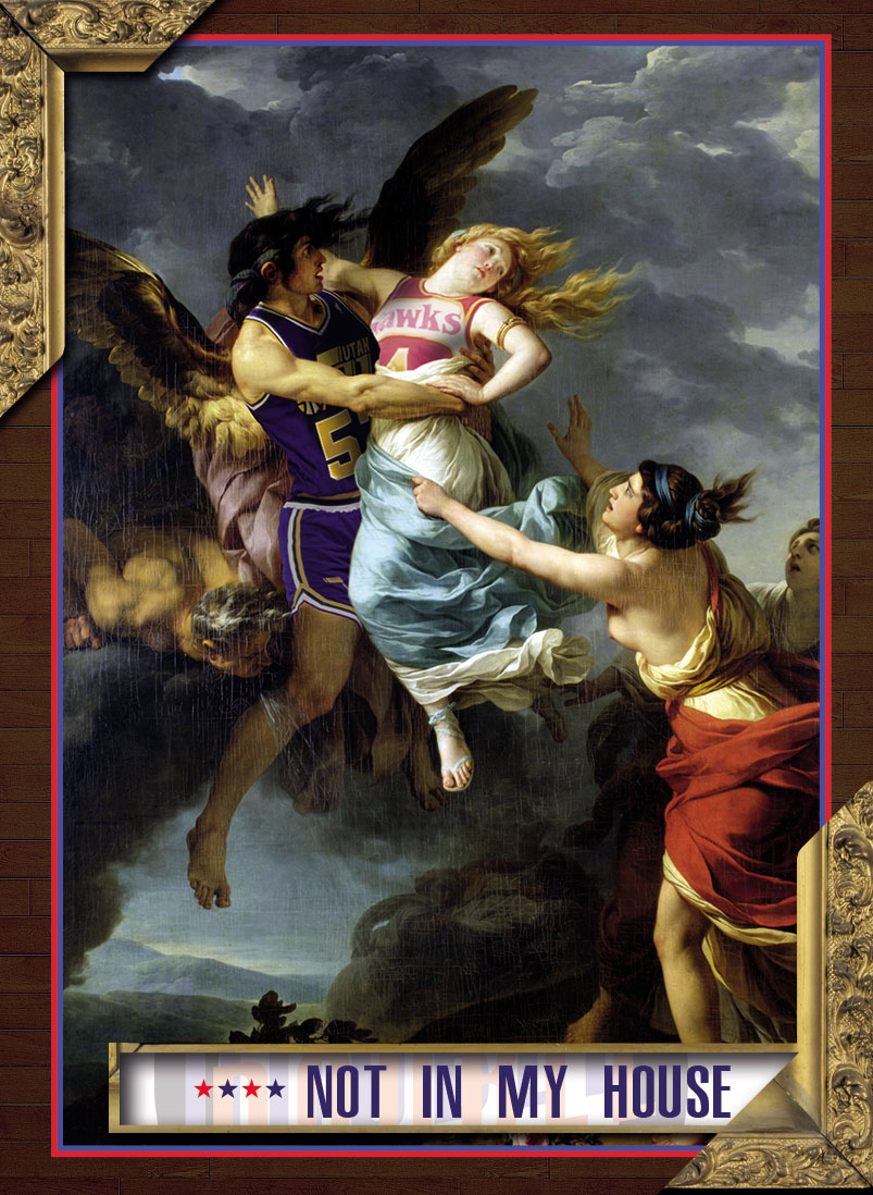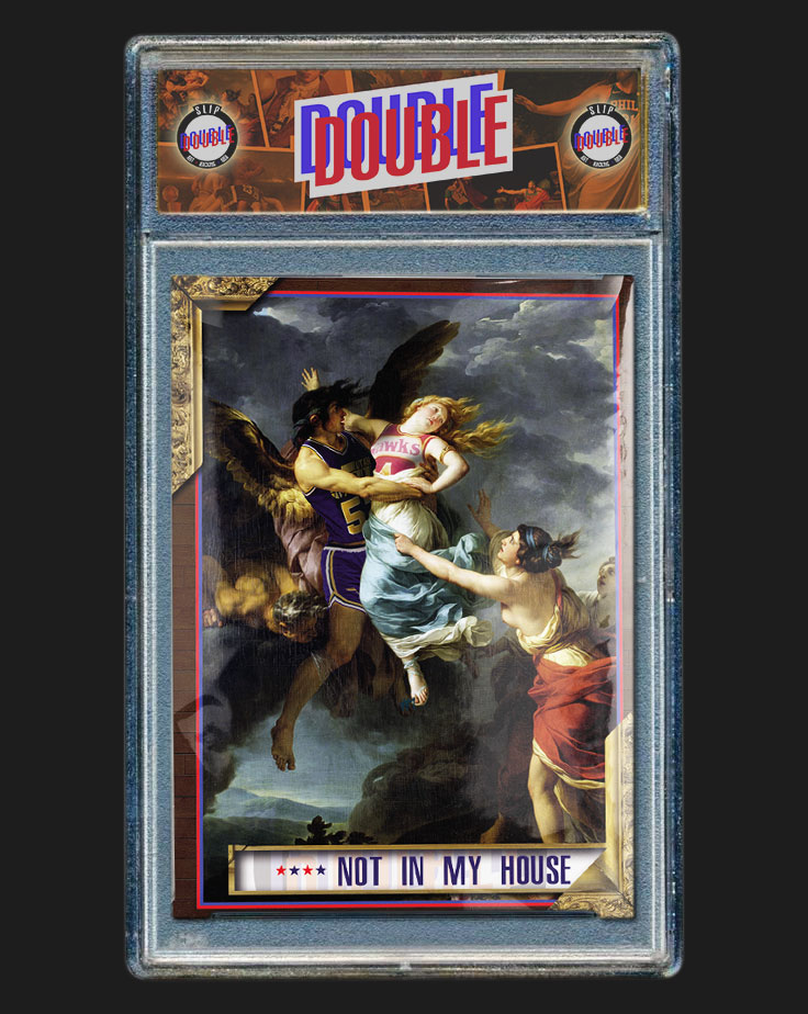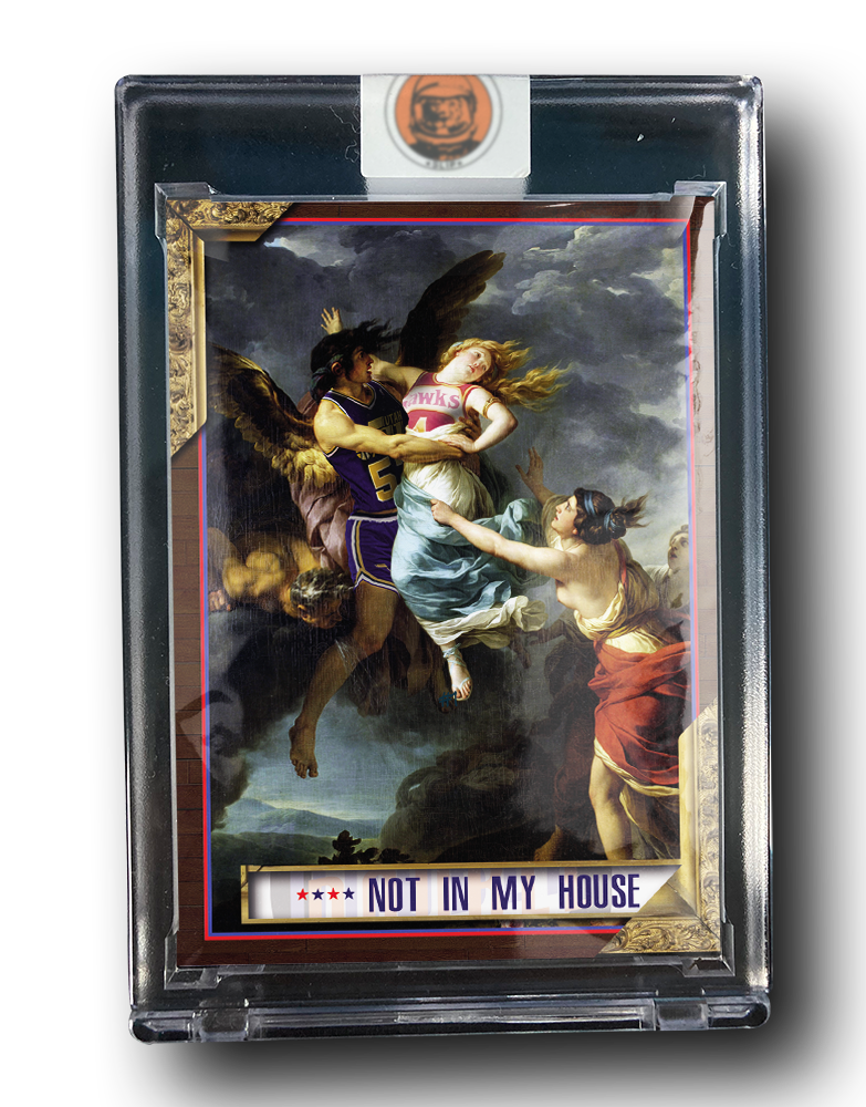 Une rencontre improbable entre puissance et agilité ! La carte DD-SLP09 « Not in My House » met en scène Mark Eaton, l’un des plus grands contreurs de l’histoire, face à Spud Webb, le prodige du dunk malgré son mètre soixante-dix. Un hommage au contraste fascinant qui fait la magie du basket.